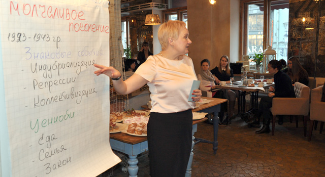 Бизнес-завтрак продолжила Ирина Шишкина, яркий представитель поколения «У»: «Давайте подумаем, чем мы отличаемся от своих родителей. Основные отличия, во-первых, в наборе ценностей – у них статусность и престижность, у нас хобби и путешествия. Во-вторых, наши отношения с системой - они часть ее, мы против. А поскольку и ценности, и взгляды у нас расходятся, существует целая пропасть между нашими стремлениями и, как итог, нашими мотиваторами. Вот тут и рождается желание “эйчарщиков” добиться помощи в управлении новым поколением». Ирина по своему немалому опыту управления, считает, что теория поколений имеет определённое влияние. И именно тем, кто сумеют применить эти знания или захотят обучиться,- теория поможет создать взаимовыгодные условия для сотрудничества всех поколений без исключения.